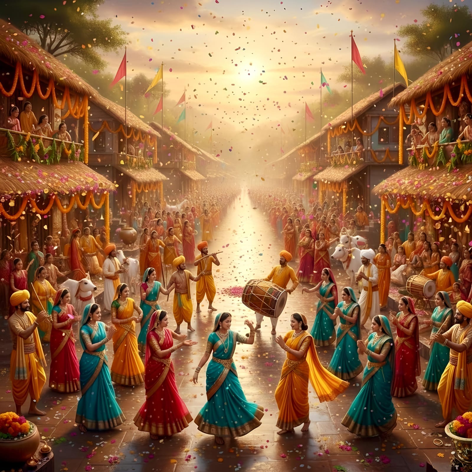 With the birth of the new prince, Gokul was transformed; every street was filled with great festivity. Every household was decorated, and the streets were sprinkled with perfumed water. Women wore brightly colored clothes, and both the gopas and gopis danced in the streets.
