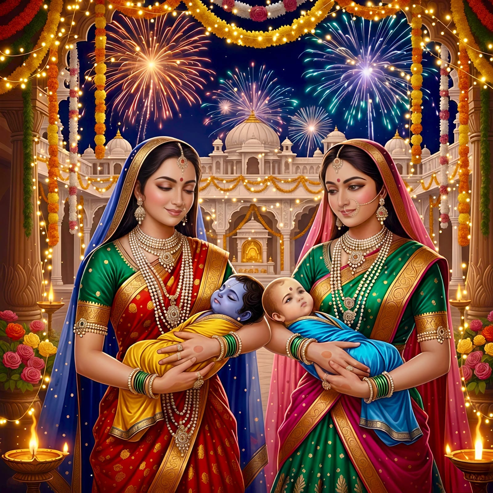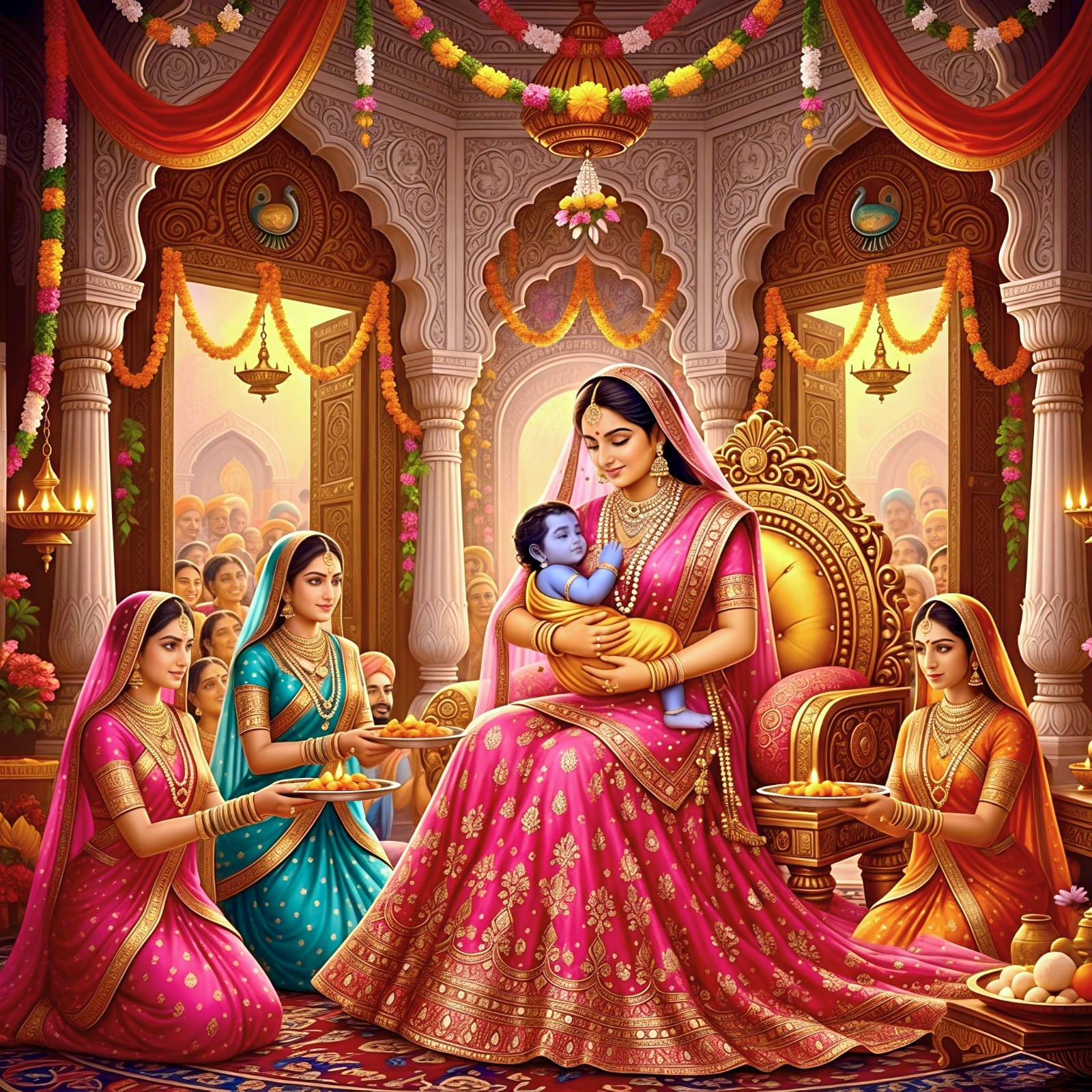 To protect the child from all harm, Nand invited the brahmins to recite sacred mantras. He generously distributed gifts to many people as part of the celebrations. The purification ceremony for the newborn, known as Jatakarma, was performed to bless and protect the child.