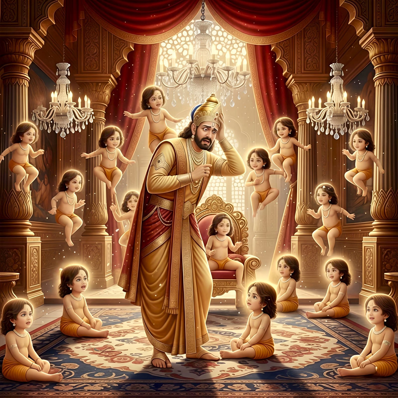 The thought that Devaki was carrying the eighth child became an obsession, consuming him. Even the simplest actions stirred his dread. While sitting down, he could have sworn he spotted a child beside him, panic seizing him.