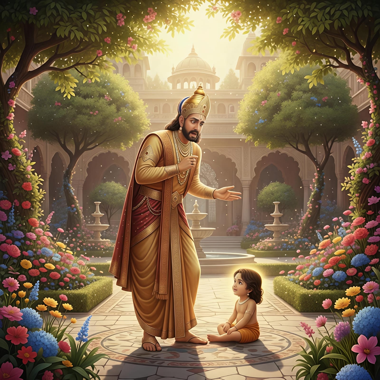 Smokeless fires, kindled by the brahmins, flickered in serenity, enveloping the earth in an aura of tranquillity. The hearts and minds of all were filled with happiness for no specific reason—except for Kans, who was unhappy.
