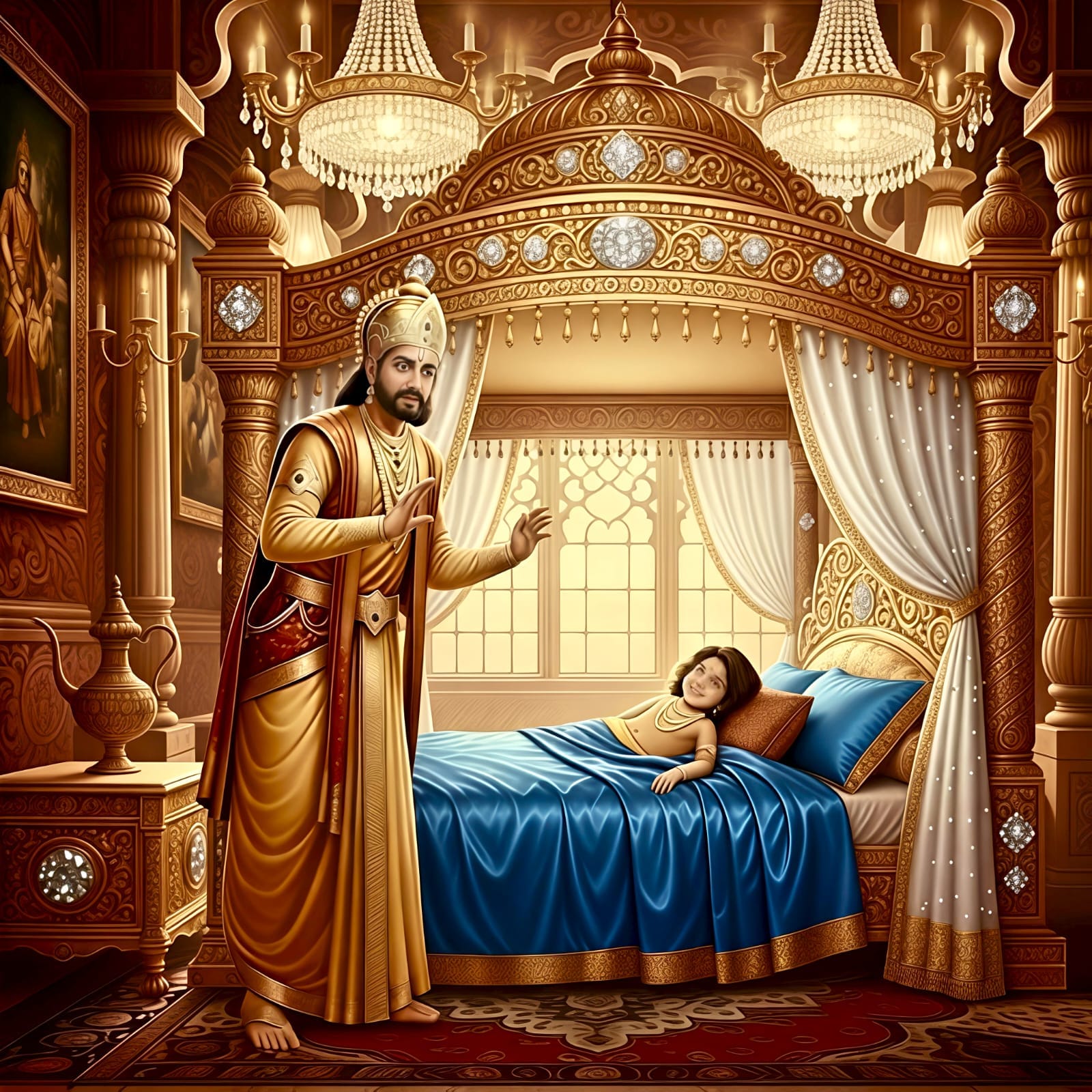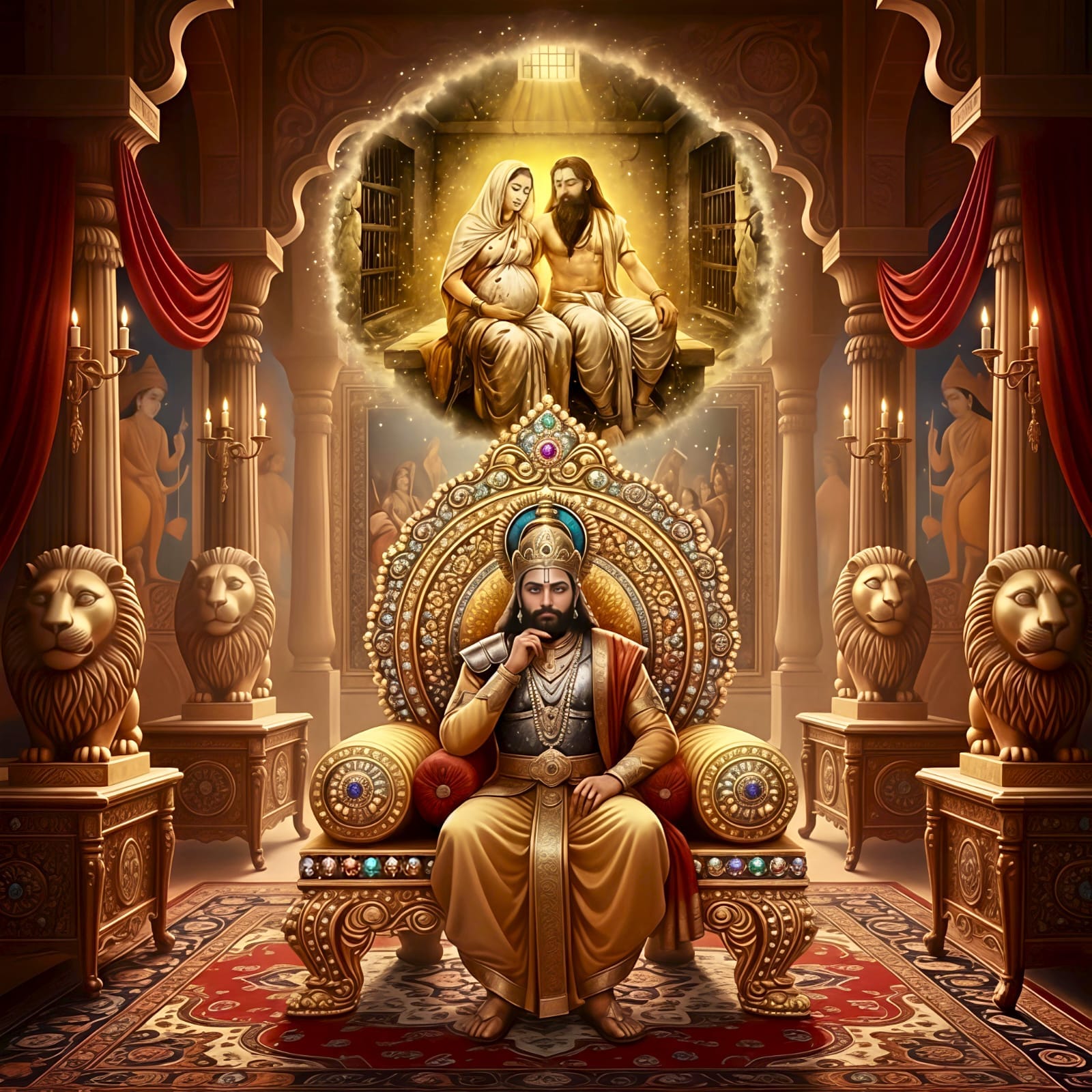 “Devaki has never looked this radiant; it must be the child she's carrying. Narayan himself is about to be born, which is why she shines so beautifully. I must take precautions for my own future. I don’t want to meet my end just yet. Killing her now crosses my mind, but she is my sister, a woman, and with a child. Taking her life would be a heinous crime, and the world would surely condemn me for it.”
