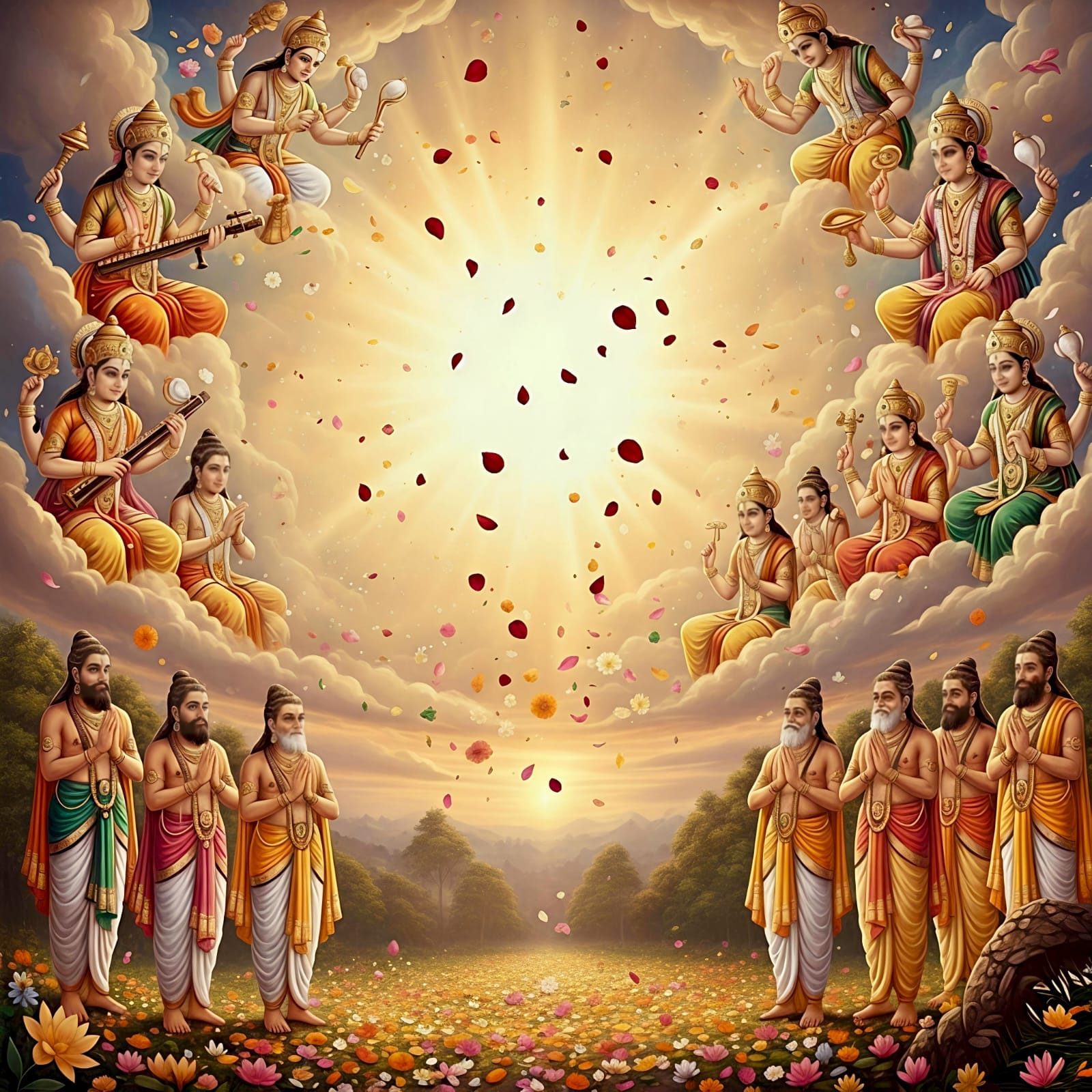 Turning to Devaki, they continued, "You are truly fortunate to be the mother of Lord Narayan Himself. Adishesh has already come into this world through you, and the child who is about to be born will be the saviour of all. Fear not, for Kans's days are numbered." After imparting this message, Brahma and the celestial hosts vanished from their sight.